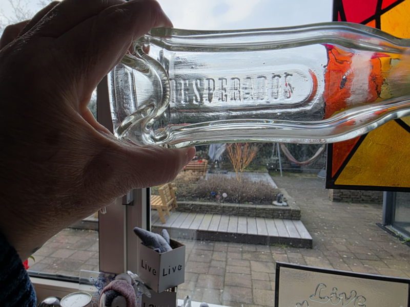 Gesmolten Grolsch flesje (met beugel)Na het smelten doe ik de beugel er weer op terug. (soms moet ik daarvoor de beugel iets verbuigen omdat de hals van de fles platter en breder is geworden door het smelten en hij niet meer zo vanzelfsprekend vastklikt in de gaatjes…