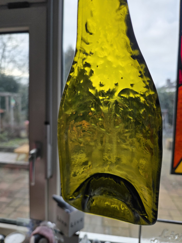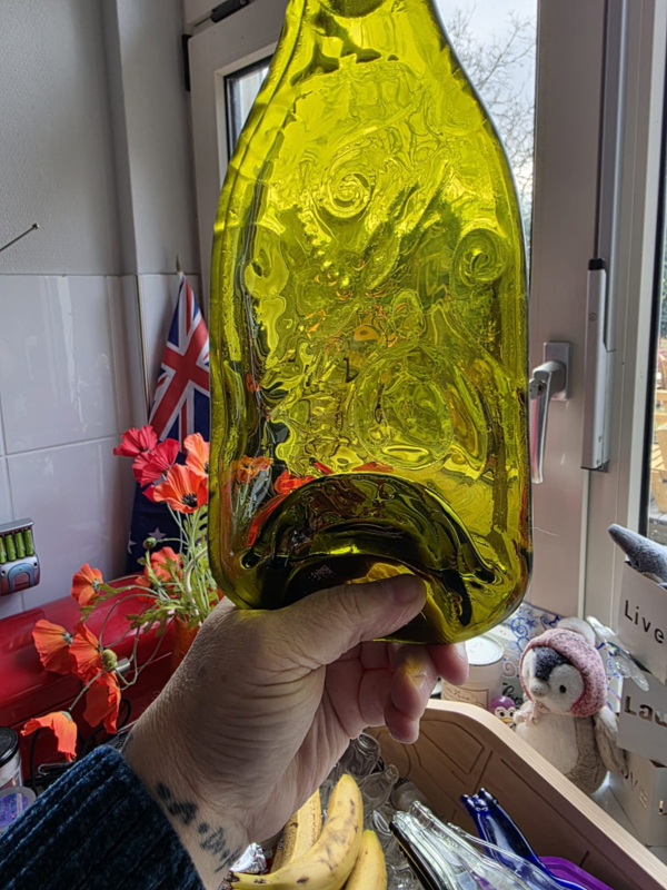 Libelle geel/groengeel/groene wijnfles met libelle patroon ingesmolten, handig als bonbon schaaltje doordat de hals een soort handvat is geworden