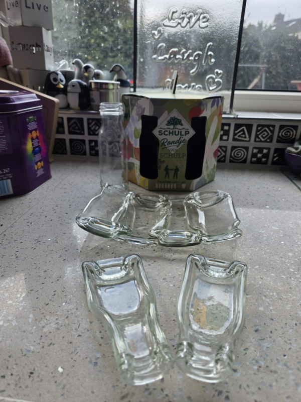 In andere gevallen is het flesje juist wel plat gesmolten om zo dienst te kunnen doen als een soort onderzetter. Zo ook bij de Grolsch hapjesplank waar 4 flesjes Grolsch aan elkaar zijn gesmolten. Ik vind het vooral leuk om herkenbare flesjes zoals Grolsch en Brand te smelten omdat deze nog 'herkenbaar' zijn na het smelten, maar ben altijd op zoek naar leuke flessen met mooie kleuren etc.